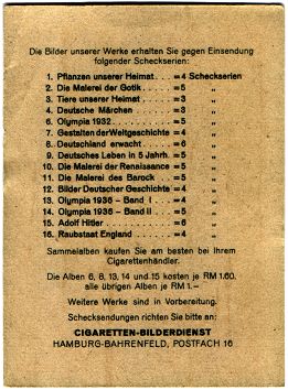 Anyone collecting German cigarette cards will find that the vast majority of cards and albums on offer are from Reemtsma. The company produced only 26 different sets, yet such was the output that over 50 years after the last pictures were issued, there is scarcely a flea market in Germany where one doesn't find some of the commoner issues.